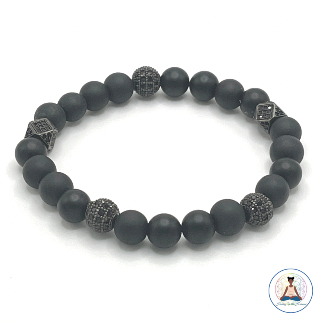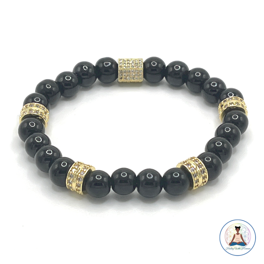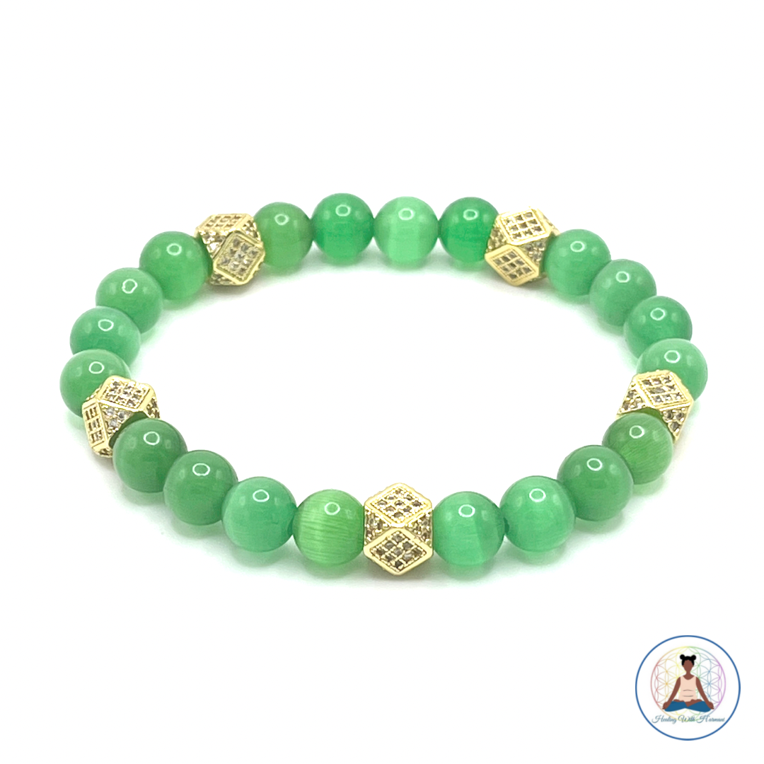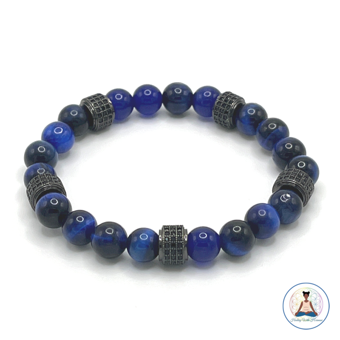 Unlock inner peace and prosperity with this beautiful Gemstone Beaded Bracelet! Feel the power of green cats eye to overcome obstacles and black onyx (matte) to help calm your mind. Dark blue cats eye and black onyx (gloss) bring clarity, while crazy agate will free your mind from sadness. What are you waiting for? Discover the power of your own gemstones today!