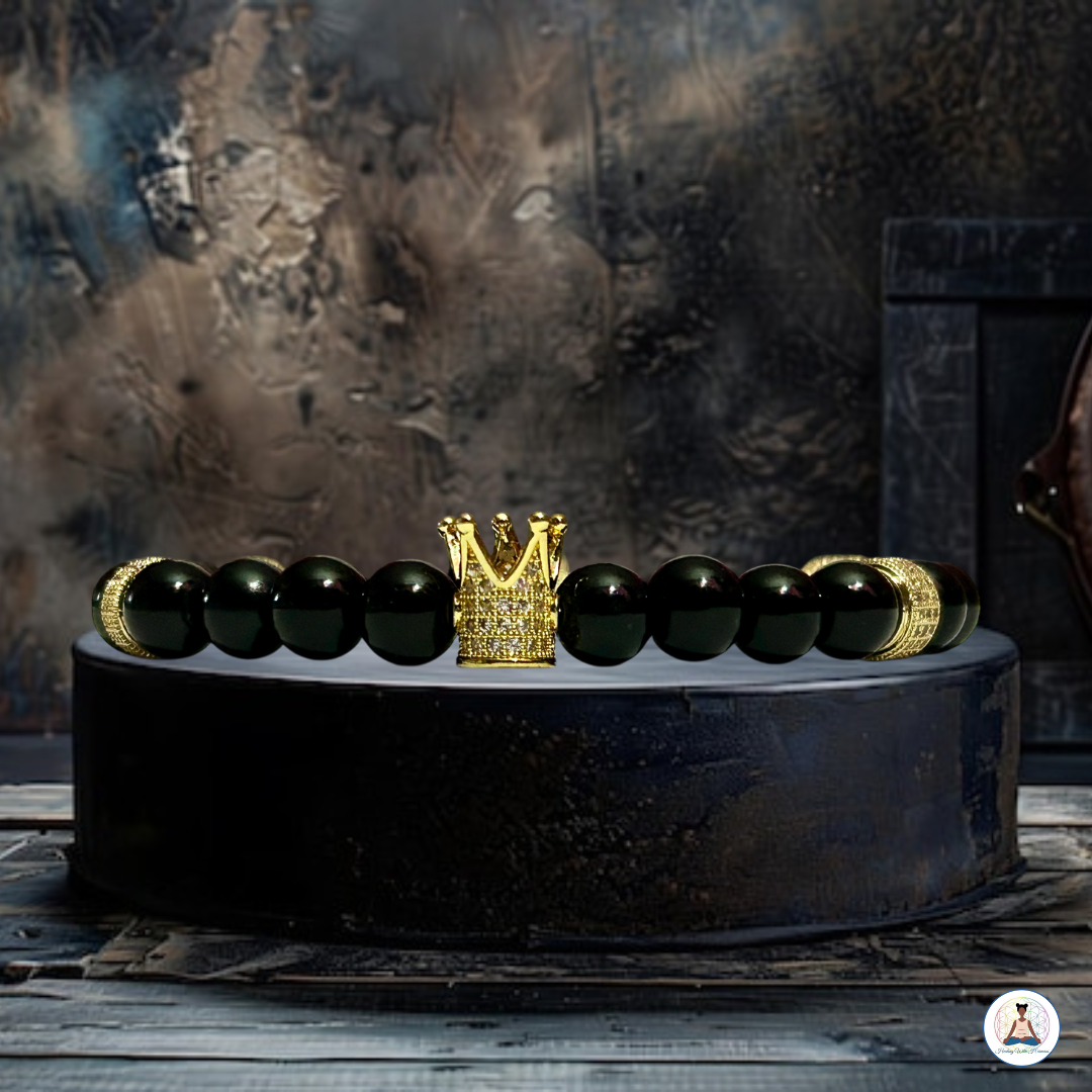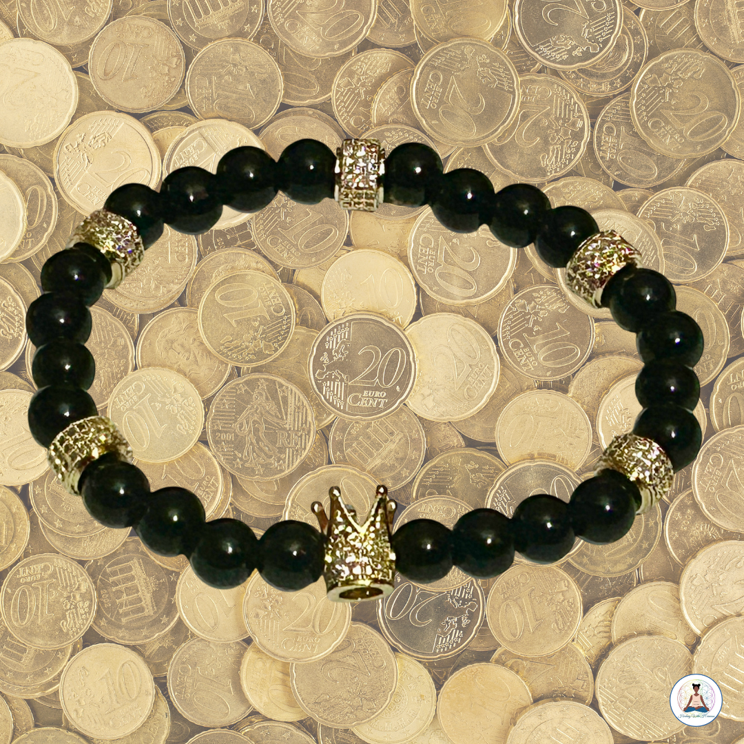 Crafted with sleek black onyx and adorned with gold Cubic Zirconia spacer beads, this accessory not only adds flair to your man's outfit, but also promotes love, stress relief, and wealth.
